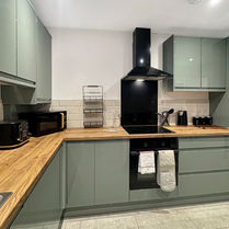 This newly renovated two-bedroom, first-floor flat in central Grantham comfortably sleeps up to four guests. The bright and welcoming living room features two cosy two-seater sofas, perfect for relaxing after a day out. The fully equipped kitchen includes a fridge, freezer, washing machine and dishwasher, along with a dining area seating four.