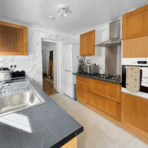 The kitchen is well-equipped, with a washing machine, clothes airer, gas hob, fridge-freezer, and fan oven. It also includes all the necessary cookware and utensils, such as Pyrex dishes, baking trays, and enough cutlery and glassware for up to 8 guests (including wine glasses and tumblers).